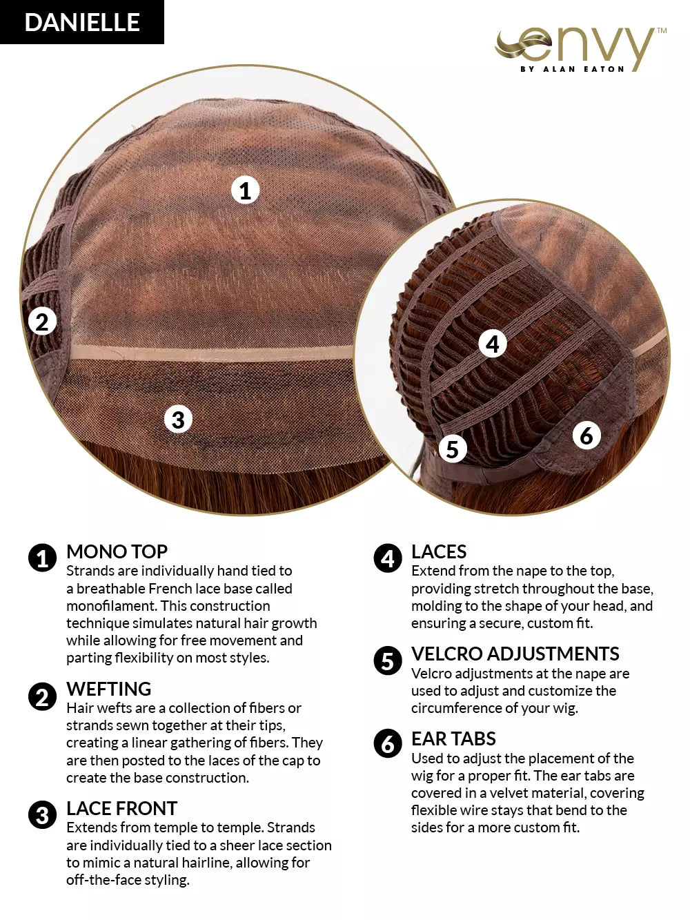 Danielle is a medium-length, long layered wig with a wavy-to-curly style with soft movement. The lace front and monofilament top create a natural hairline and versatile parting, while the hand-tied cap ensures lightweight comfort. Made from human hair and heat-friendly fiber for effortless styling and lasting wear.