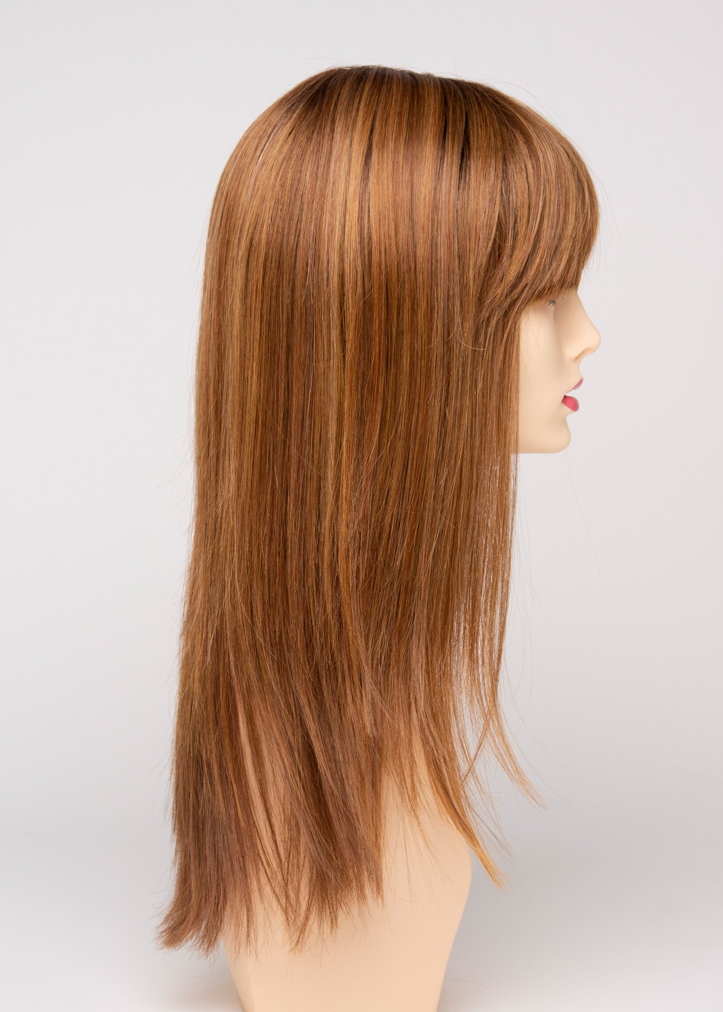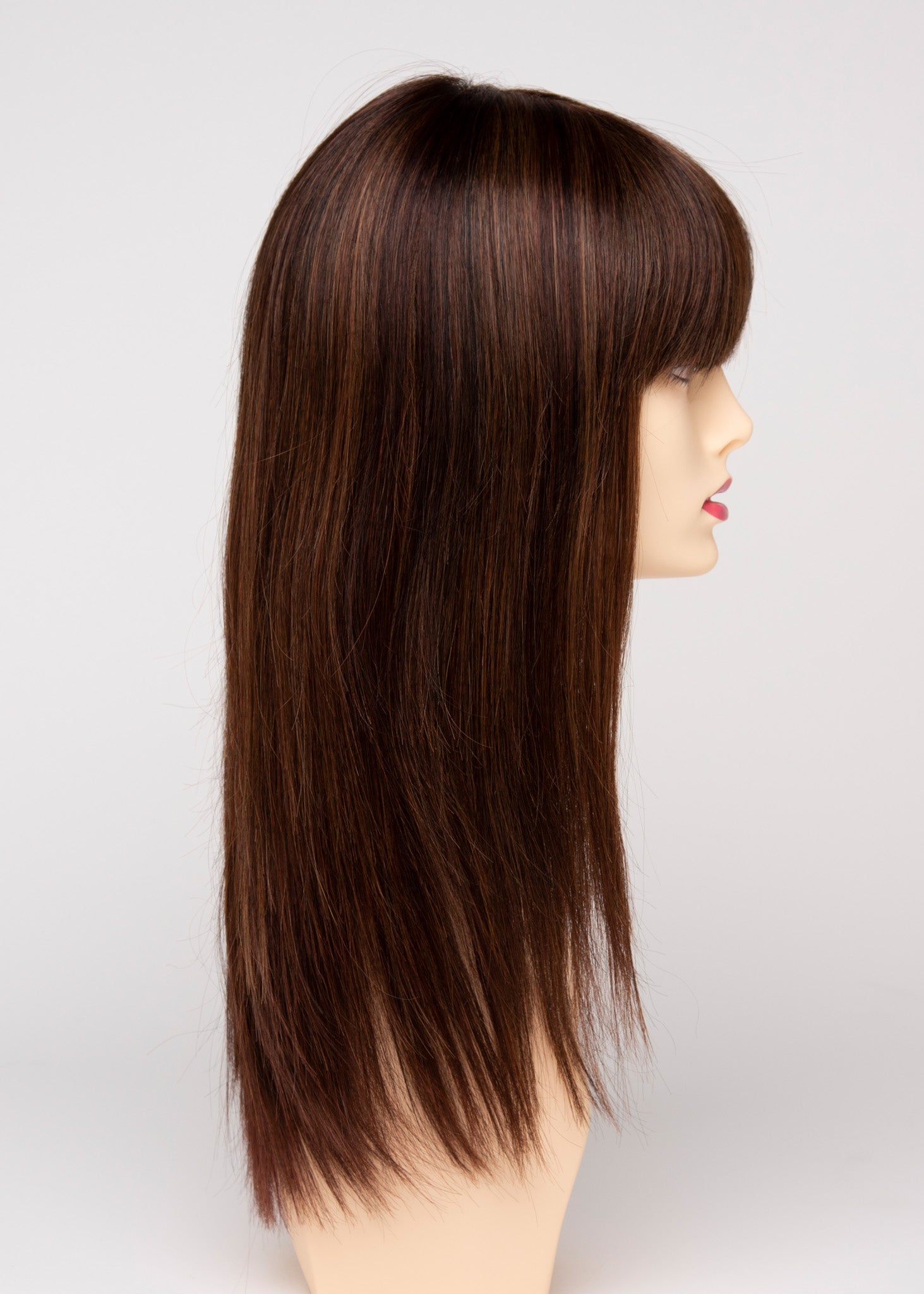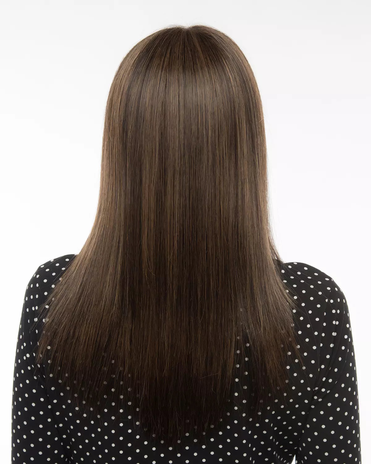 Taryn is a long, layered style with sleek, straight strands and soft, face-framing bangs. The monofilament top offers natural parting and a realistic look, while the human hair and heat-friendly fiber blend allows endless styling versatility for a timeless, polished finish.