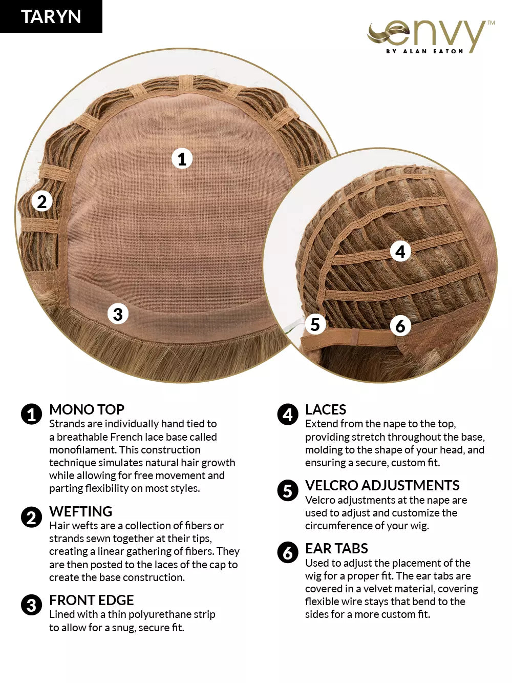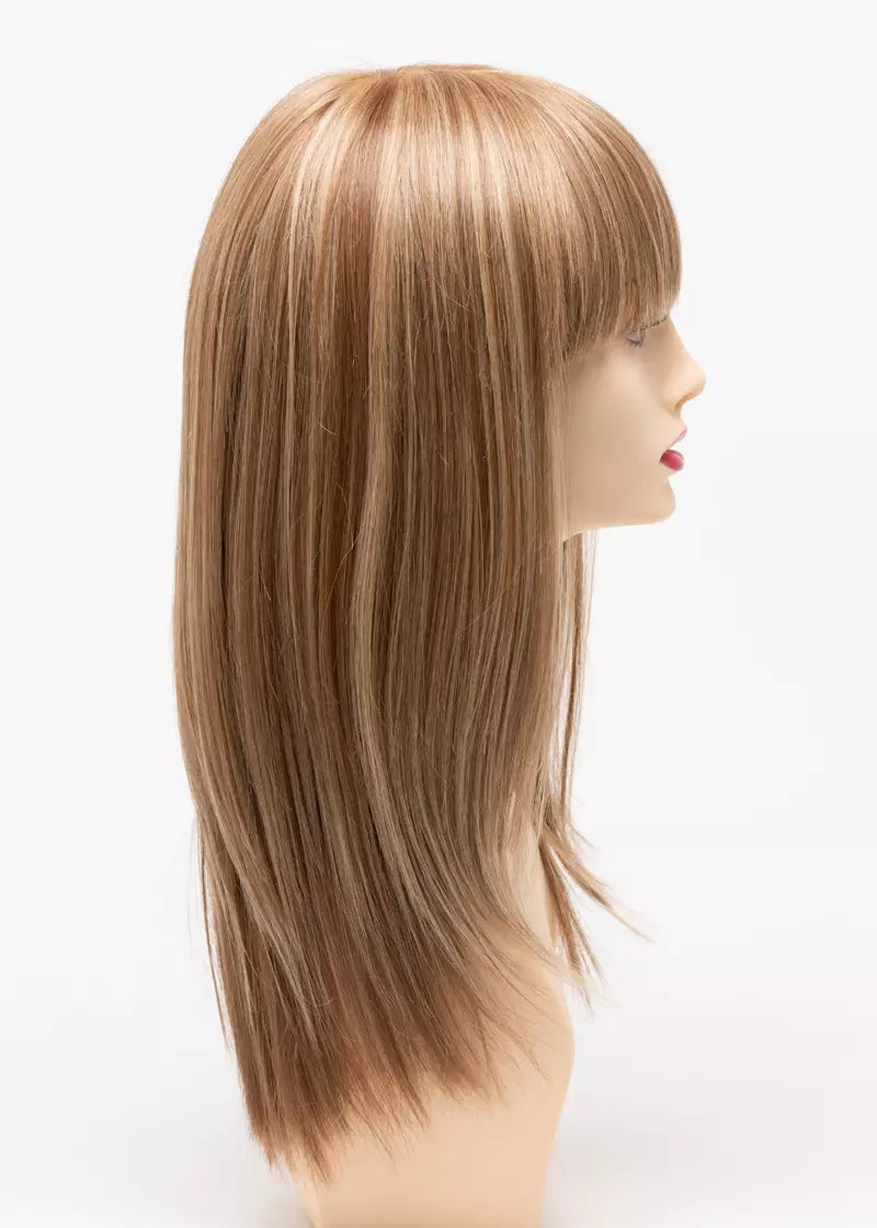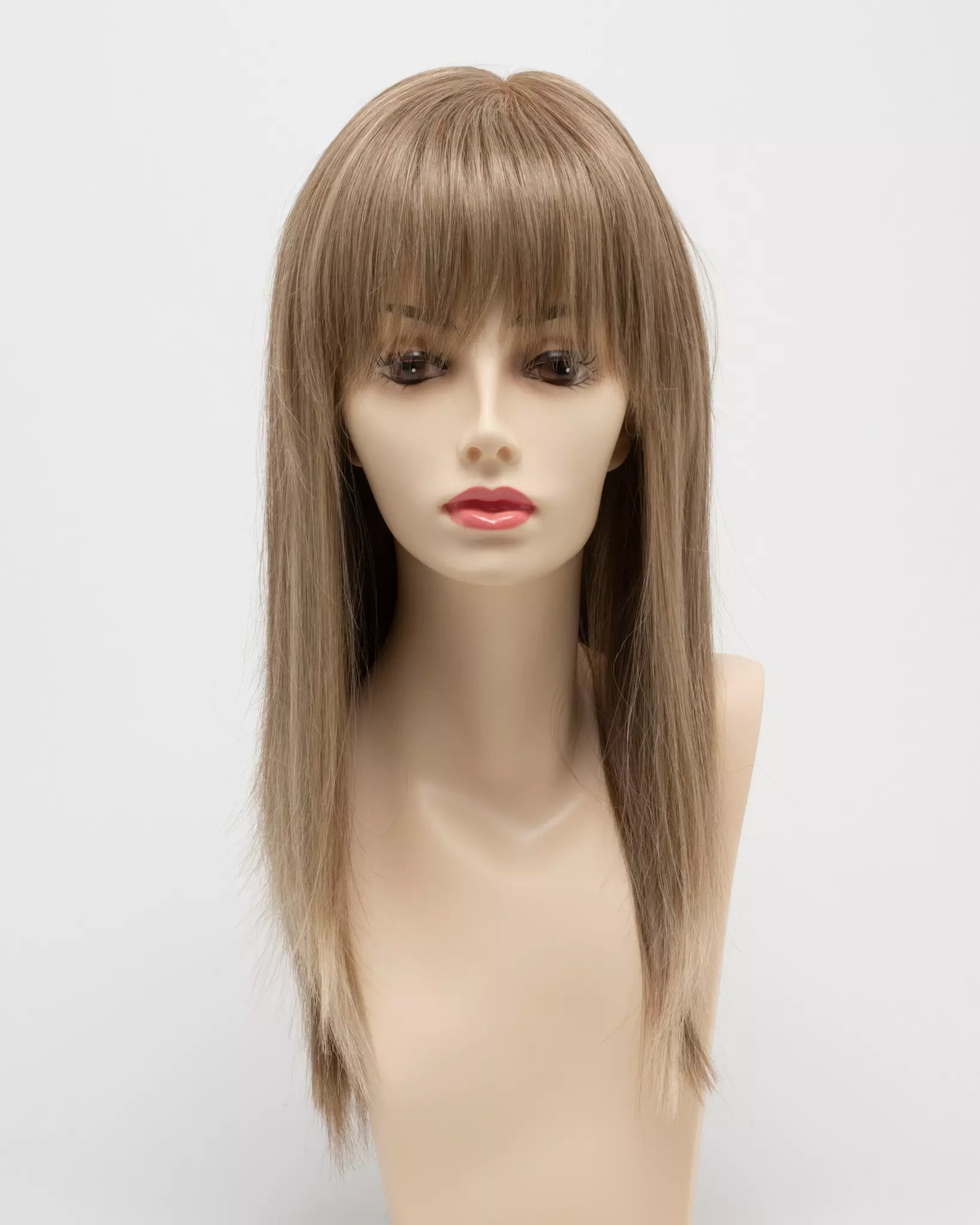 Taryn is a long, layered style with sleek, straight strands and soft, face-framing bangs. The monofilament top offers natural parting and a realistic look, while the human hair and heat-friendly fiber blend allows endless styling versatility for a timeless, polished finish.