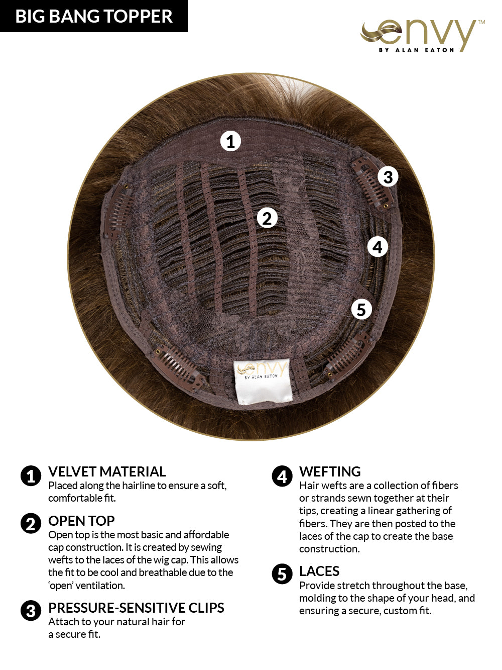 Made from the best 100% KANEKALON® FIBER and available in 15 multi-dimensional shades, our NEW BIG BANGS Topper gives you today’s on-trend wispy bangs and face-framing layers, while adding the perfect amount of “blow-out” volume on top. And thanks to our light, breathable open top construction, it’s only your look that will be hot.