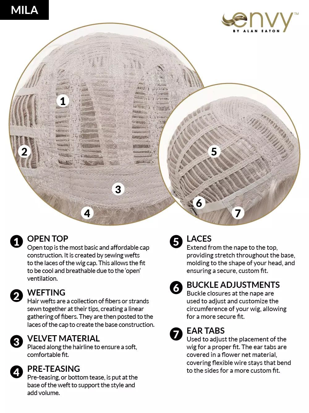 MILA by ENVY is a lovely, shoulder-length shag with face-framing pieces that compliment any age and face shape. Dramatic layering gives this look lots of movement and volume, while our Open Top construction keeps things lightweight and comfortable.