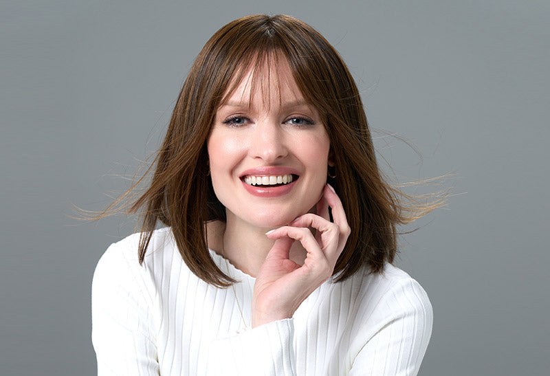 A sleek, medium-length bob with soft bangs and feathered ends. Paige features an extended lace front, monofilament top, and hand-tied cap for a natural look and lightweight comfort. Made with EnvyHair™, our exclusive human hair and heat-friendly fiber blend, Paige gives you endless styling versatility with effortless elegance.